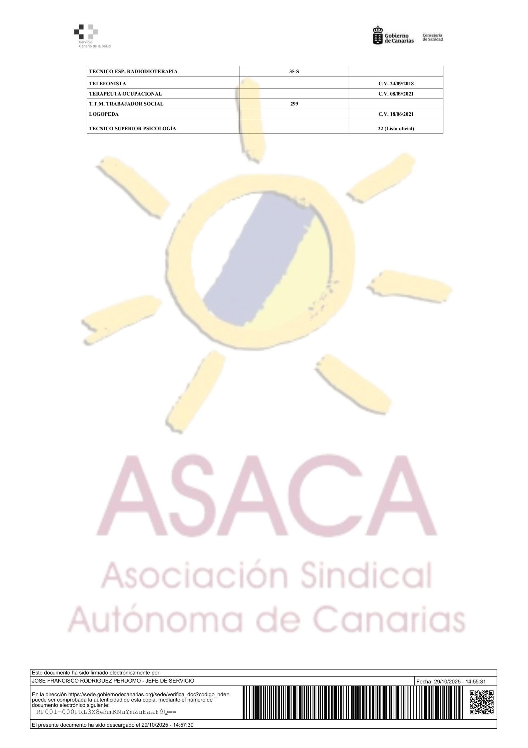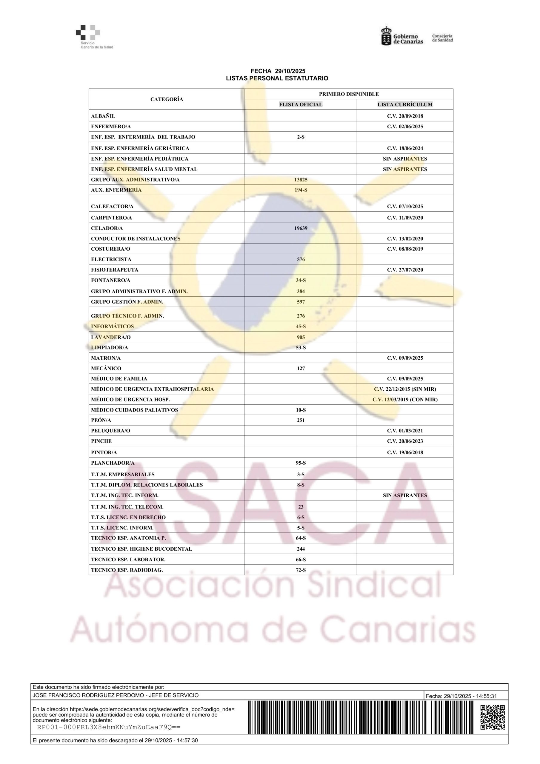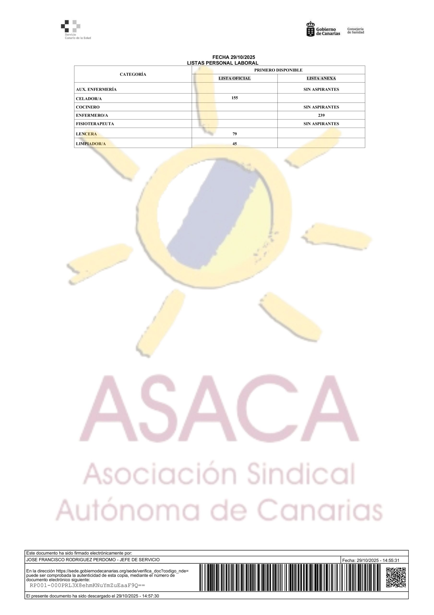 AREA DE SALUD DE LANZAROTE CONTRATACION PRIMER DISPONIBLE A 29 DE JUNIO DE 2025