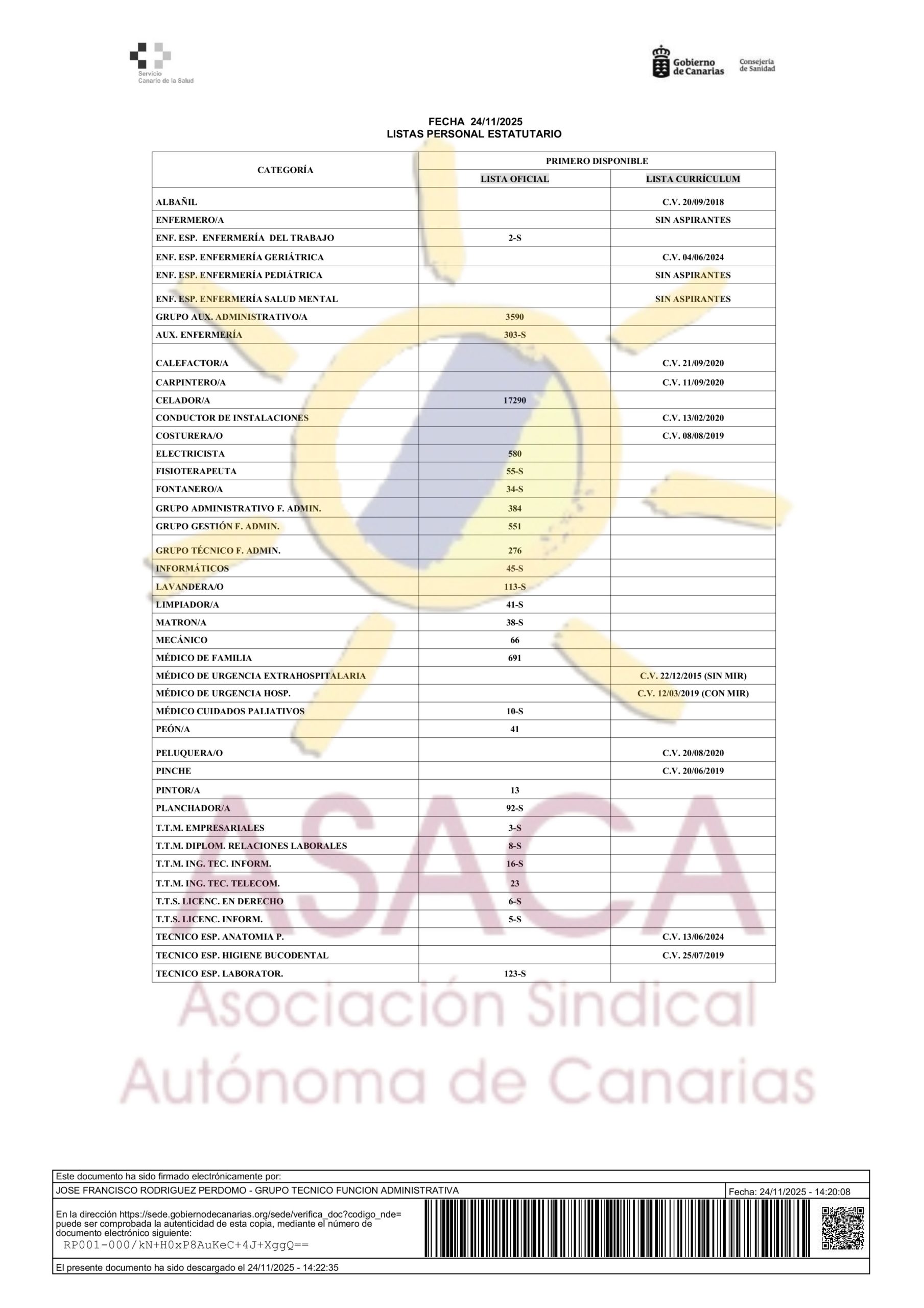 AREA DE SALUD DE LANZAROTE CONTRATACION PRIMER DISPONIBLE A 24 DE NOVIEMBRE DE 2025