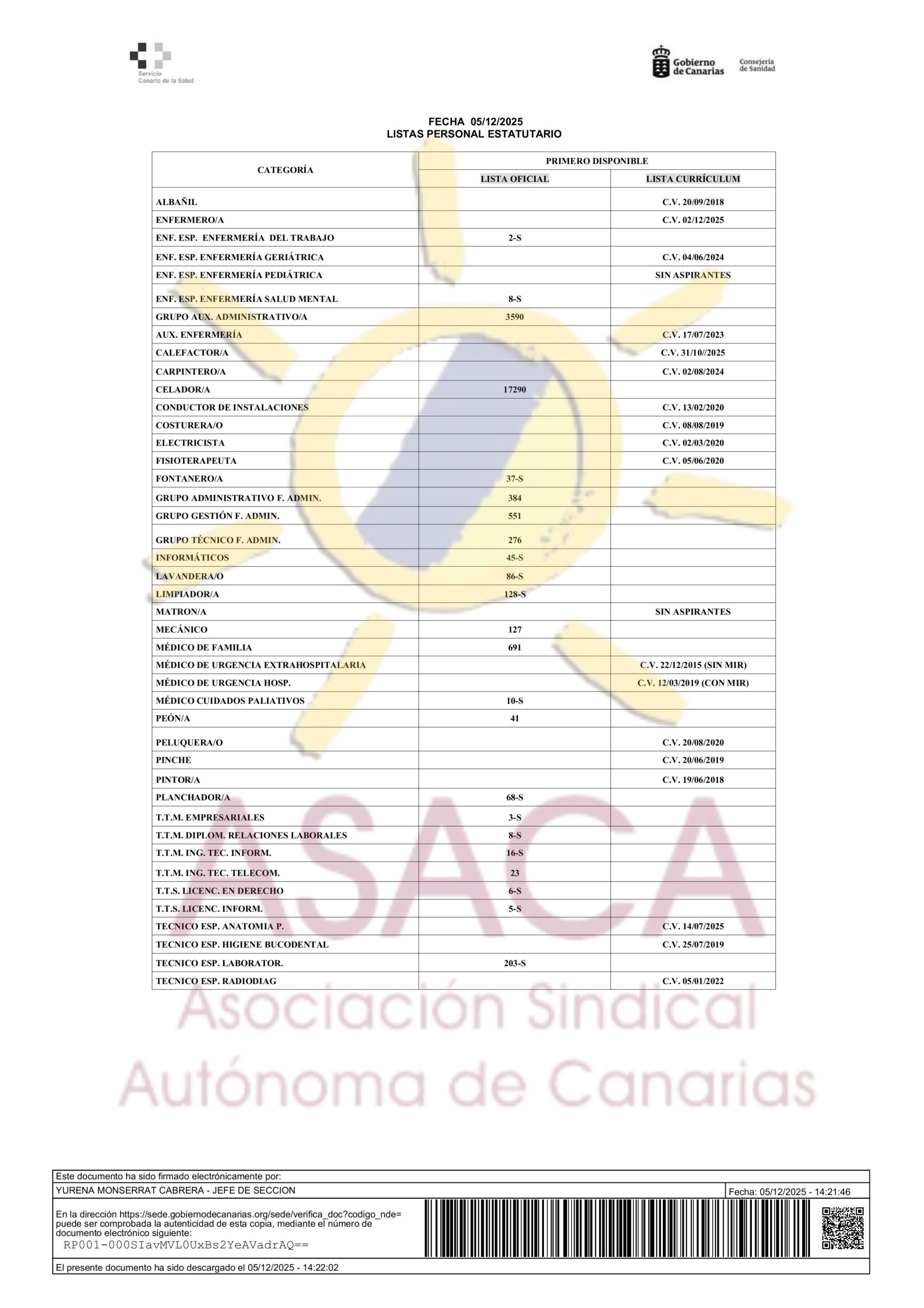 AREA DE SALUD DE LANZAROTE CONTRATACION PRIMER DISPONIBLE A 05 DE DICIEMBRE DE 2025