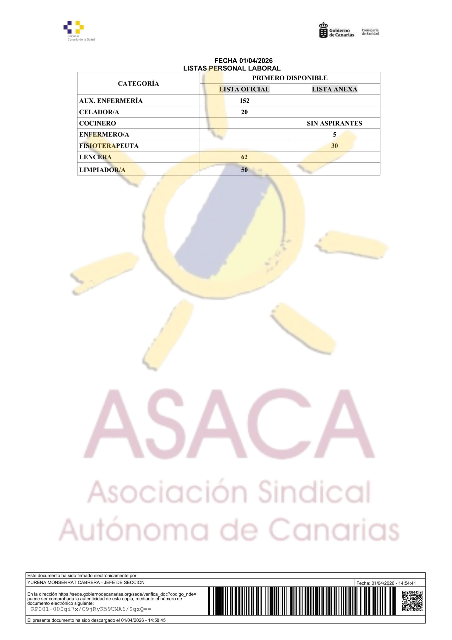 AREA DE SALUD DE LANZAROTE CONTRATACION PRIMER DISPONIBLE A 01 DE ABRIL DE 2026