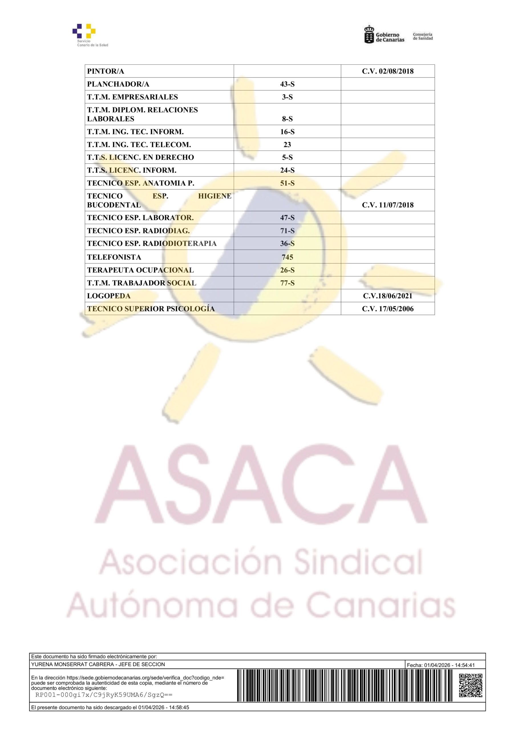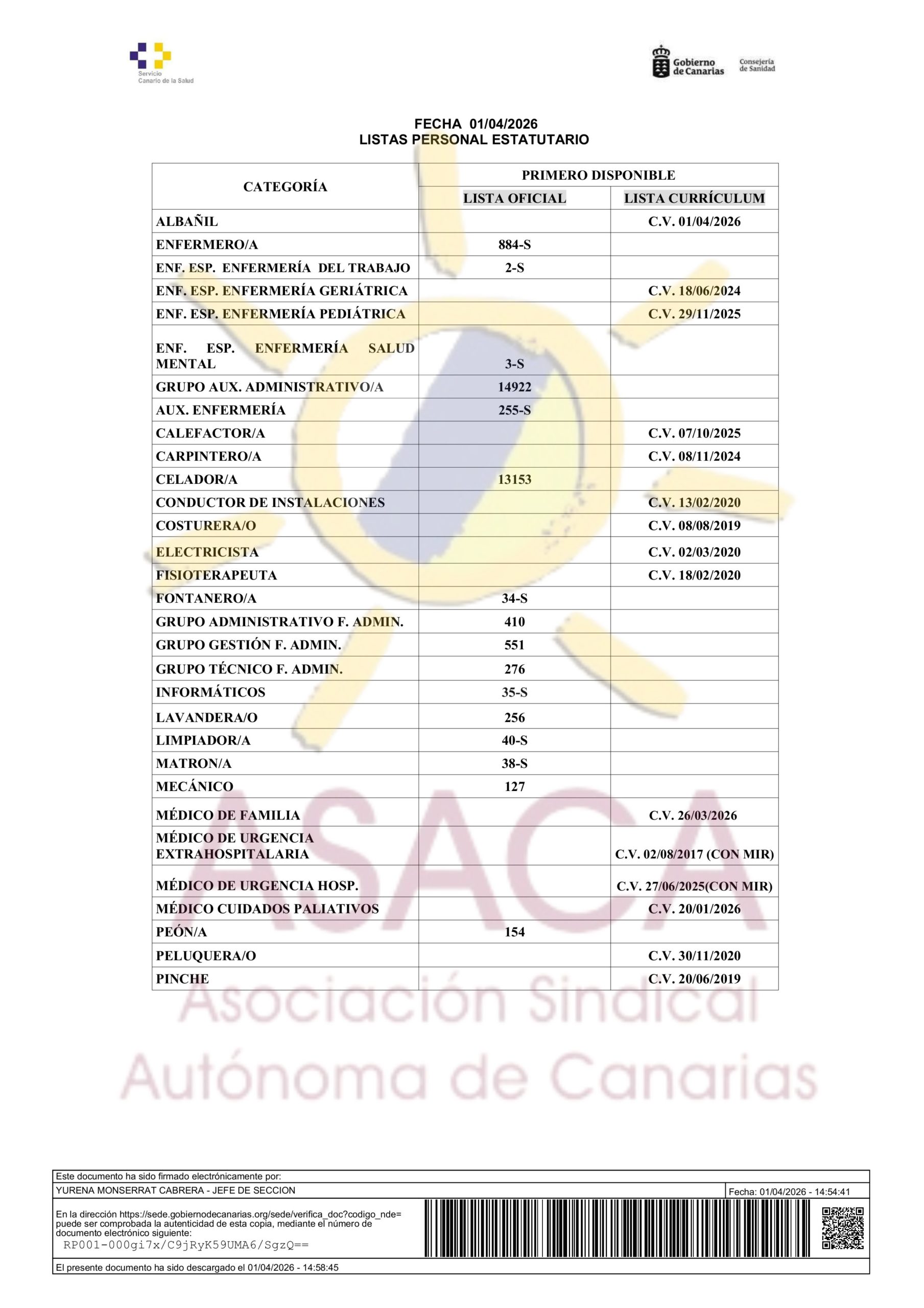 AREA DE SALUD DE LANZAROTE CONTRATACION PRIMER DISPONIBLE A 01 DE ABRIL DE 2026