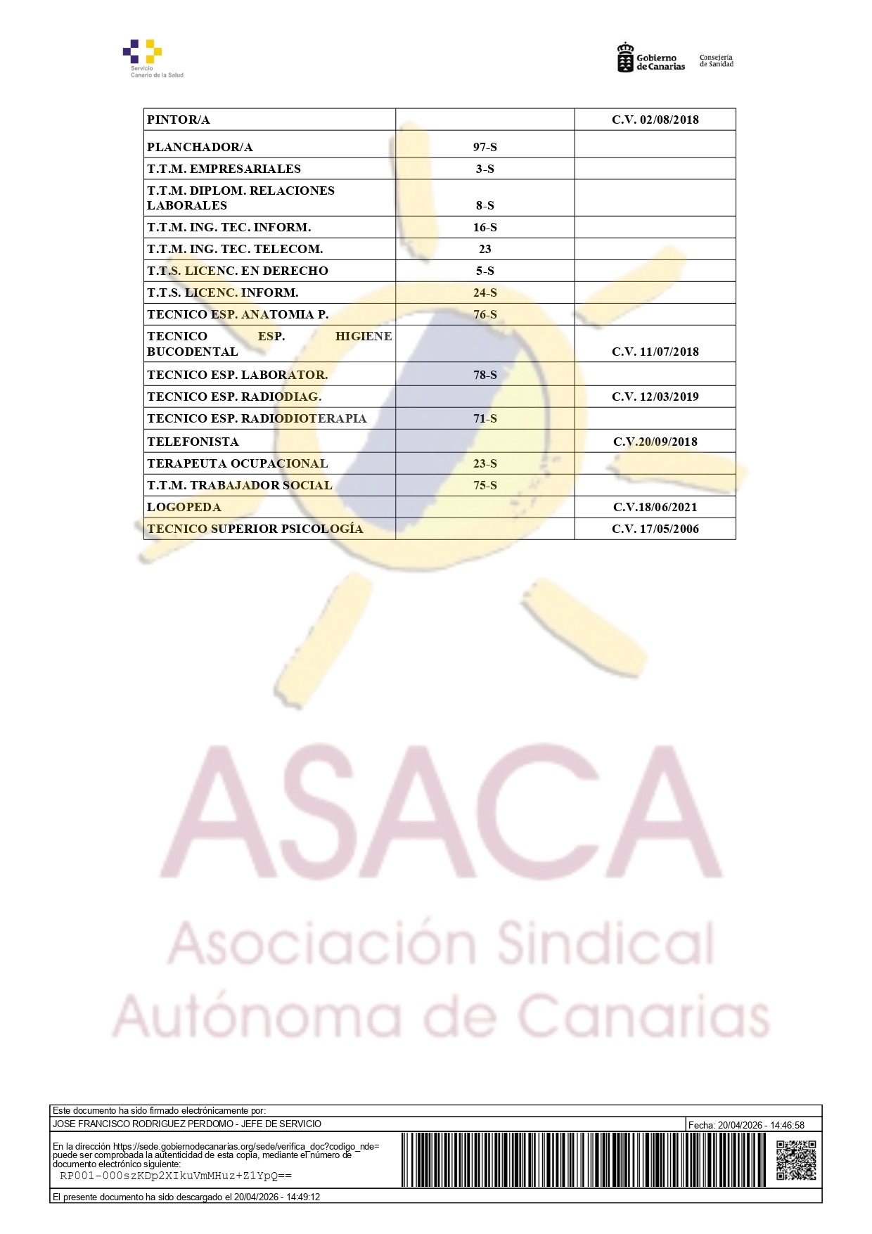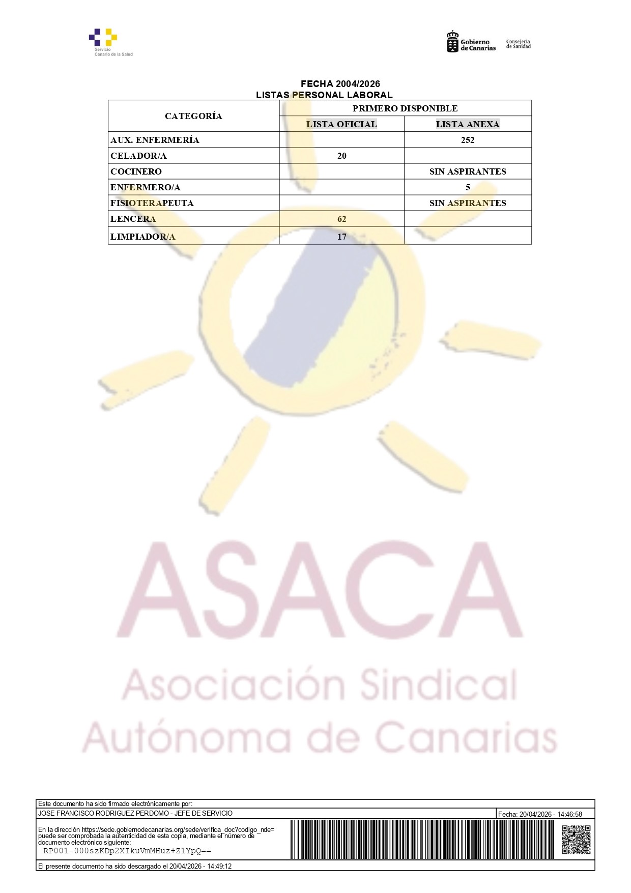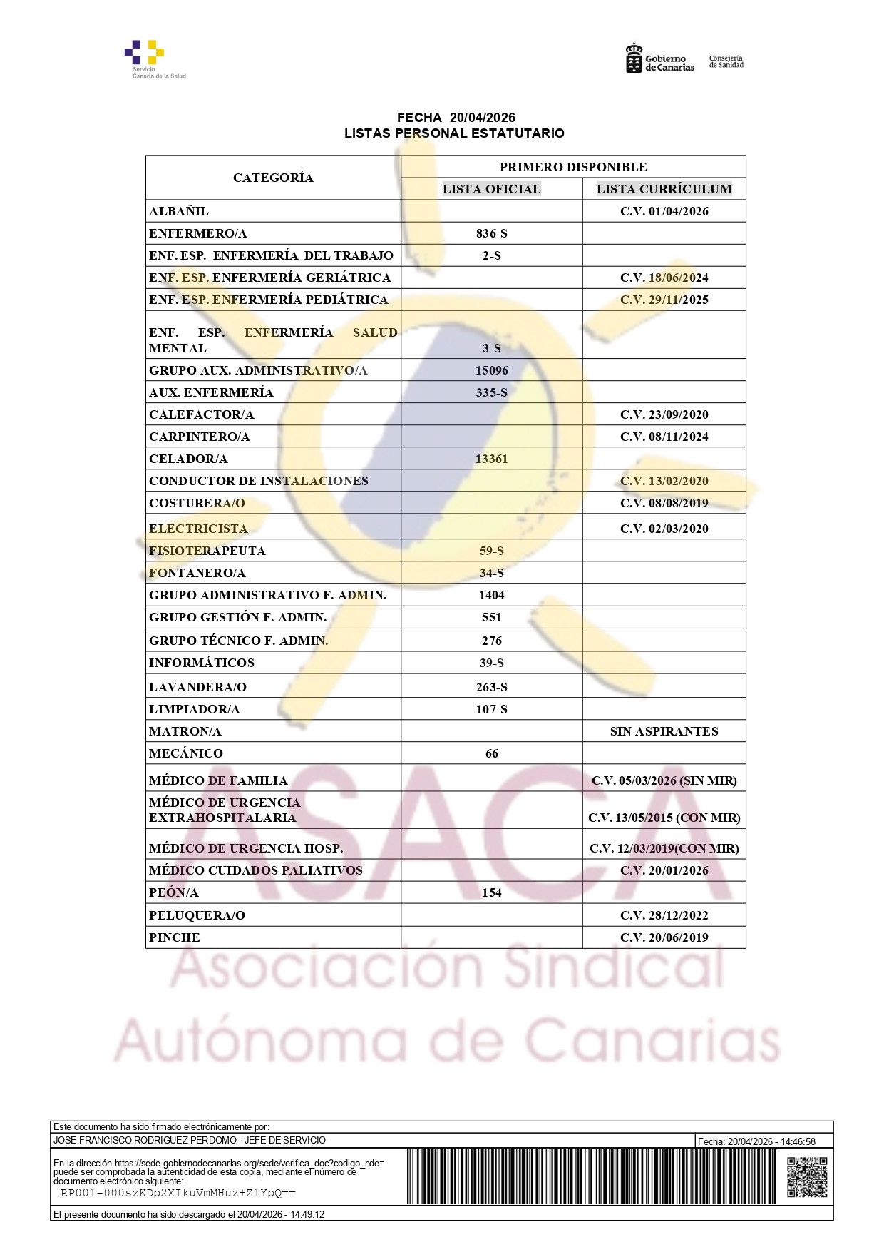 AREA DE SALUD DE LANZAROTE CONTRATACION PRIMER DISPONIBLE A 20 DE ABRIL DE 2026