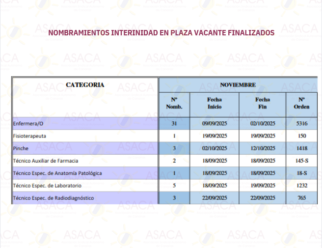 Les informamos que hoy 02/10/2025 nos ha sido comunicada la finalización del llamamiento de interinidades de todas las categorías nombradas a continuación, con fecha de inicio 17/11/2025.