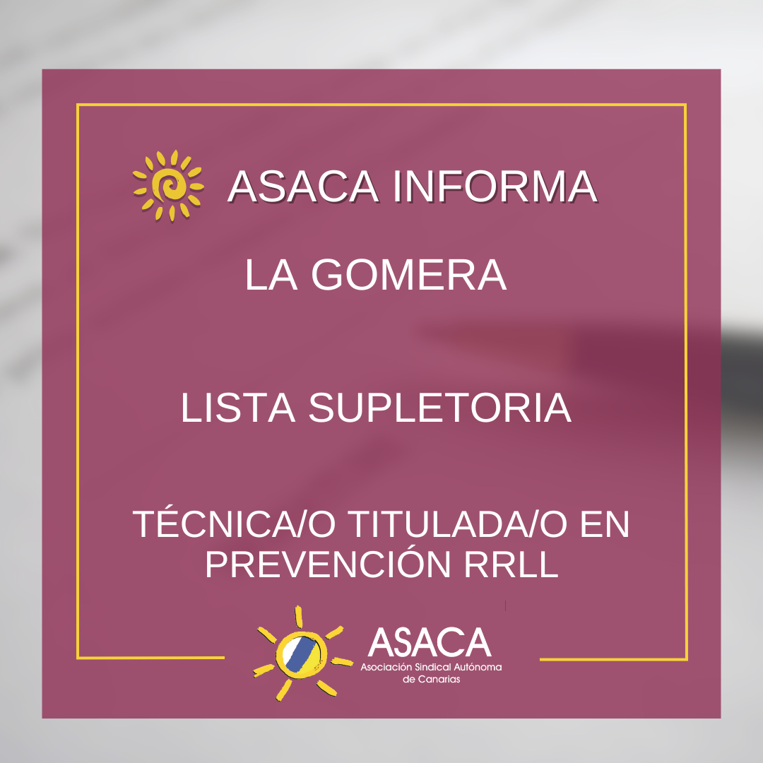 LA GOMERA RELACIÓN DEFINITIVA DE ASPIRANTES ADMITIDOS Y EXCLUIDOS Y LISTA SUPLETORIA PROVISIONAL DE TÉCNICA/O TITULADA/O MEDIO EN PREVENCIÓN RRLL.